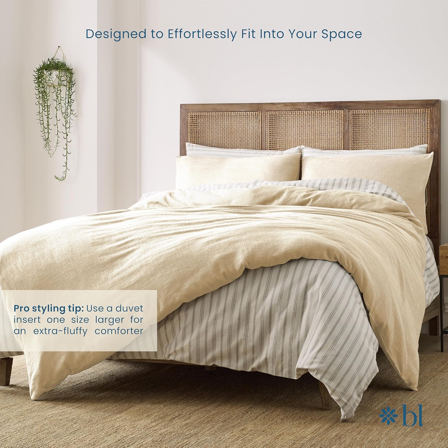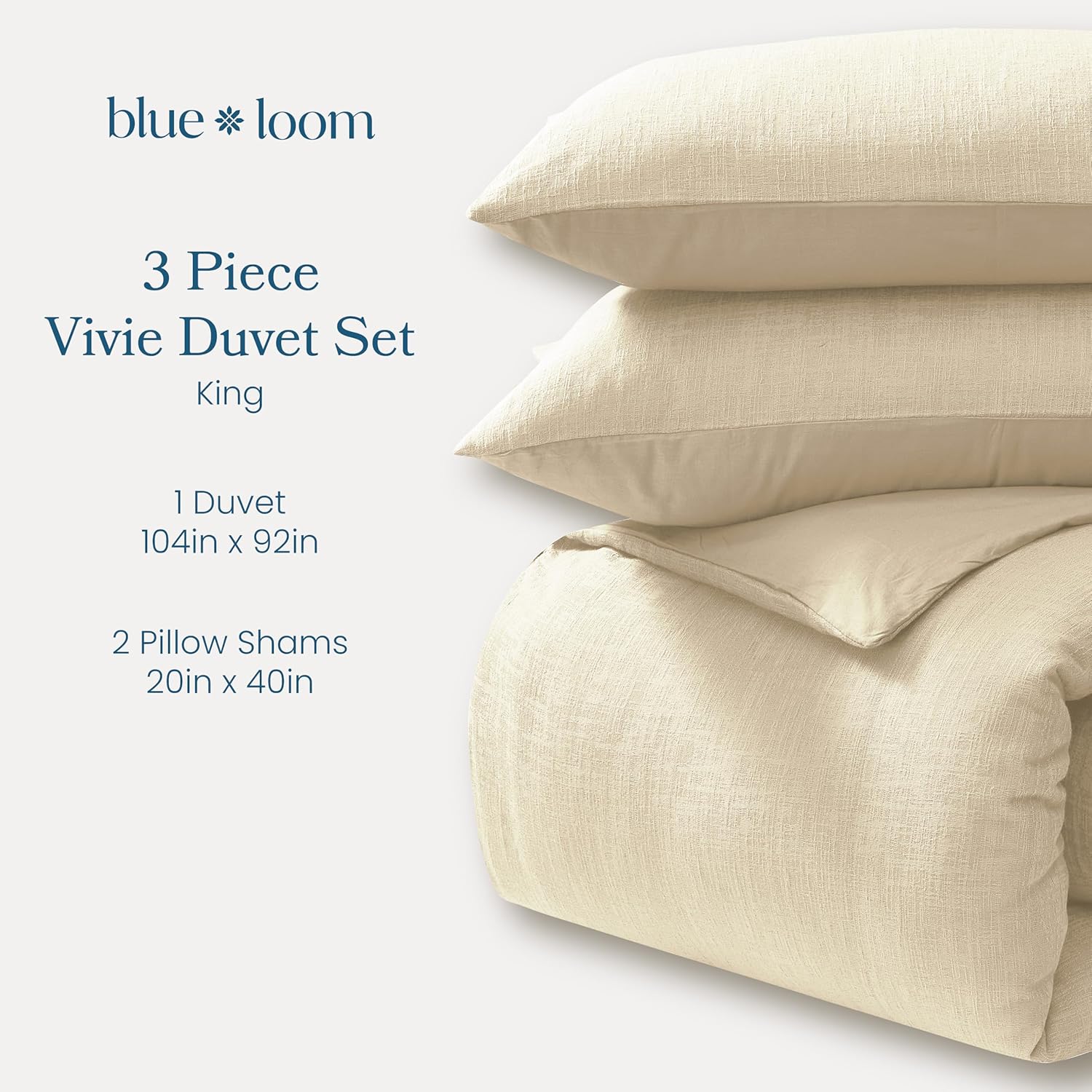 We're giving you a reason to stay in bed a little longer. Meet the Vivie Duvet by Blue Loom – a super soft, stonewashed duvet designed for ultimate comfort and effortless style. Crafted with a relaxed, worn-in feel, this duvet features a subtle texture that brings a modern twist to bed comfort. Available in Full/Queen size (92"W x 90"L) and King size (104"W x 92"L), the Vivie Duvet offers a perfect duvet for your bedroom. It will elevate your bedding and the look for your entire bedroom. Choose from four versatile colors: denimn, clay, slate, and undyed to complement any décor, whether you prefer a soft neutral or a bold statement. This is for both the duvet and 2 matching pillow shams. Button enclosures on the shams and the 4 corners, securing your duvet in place for a good night sleep. Matching sizing for both queen and king sizes. Cozy, stylish, and easy to care for, Vivie is your new favorite reason to stay under the covers. A timeless solid design, making it ideal for mix-and-matching with your favorite bedding.